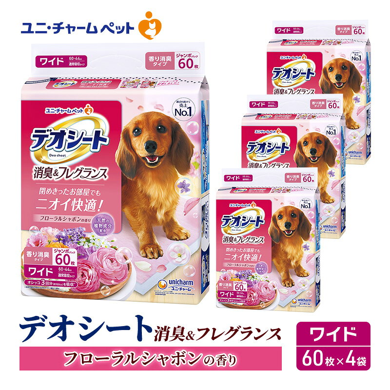 【ふるさと納税】【期間限定】生活応援価格 デオシート 消臭&フレグランス フローラルシャボンの香り ワイド 60枚×4 ペットシーツ ペットシート トイレ 犬 犬用トイレ ペット 清潔 ユニ・チャーム 愛犬用 ペット用品 新改良のアロマ成分で消臭力UP! ●天然の植物成分を配合した、まるでお花畑にいるような安心感、清潔感ある香り ●清潔感のある「ナチュラルピンク」のシートとふわさら吸収シートでオシッコの見た目も清潔! ●シートサイズ:レギュラー(44cm×32cm)、ワイド(60cm×44cm) 寄附金の用途について 市民の健康と安心した生活をささえます。